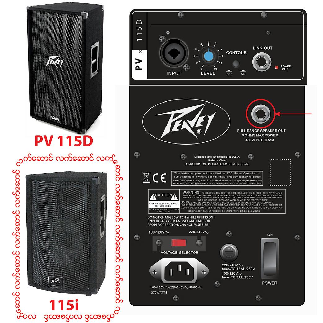 PV 115D (Active - အသံခ်ဲ ့စက္ပါဝင္ၿပီး) စပီကာတစ္လံုးသည္ သူ့အတြက္ သီးသန့္ အသံခ်ဲ ့စက္ပါဝင္႐ံုသာမက (မသိသူေက်ာ္သြား သိသူေဖာ္စား) အျခားေသာ 400 Watts @ 8 Ohms ျပင္ပမွ Passive (Amp မပါေသာ) Full Range စပီကာတစ္လံုးကို Power ေပးႏုိင္သည္။ ထို ့ေၾကာင့္ PV 115D စပီကာတစ္စံု ဝယ္ယူသူအတြက္ 115i (၁၅ လက္မ) စပီကာတစ္စံုကို လက္ေဆာင္ေပးပါမည္။ ထို ့ေၾကာင့္ PV 115D တစ္စံု ဝယ္ယူလိုက္ပါက ၁၅ လက္မစပီကာ ၄ လံုး(၂ စံု) ပိုင္ဆုိင္ႏိုင္ၿပီး သီးသန့္ အသံခ်ဲ ့စက္ ထပ္မံဝယ္ယူရန္လဲ မလိုအပ္ပါ။ (ပံုတြင္ ျပင္ပမွ စပီကာ တစ္လံုးခ်ိတ္ရန္ Speake Output ကို အနီေရာင္မွ်ားျဖင့္ ျပသထားပါသည္။) ဤအတြဲဝယ္ယူပါက PV 115D ႏွင့္ watts တူေသာ တစ္စံု ၄ သိန္းတန္ဖိုးရွိ 115i (15 လက္မ) Passive စပီကာ တစ္စံု လက္ေဆာင္ေပးပါမည္။